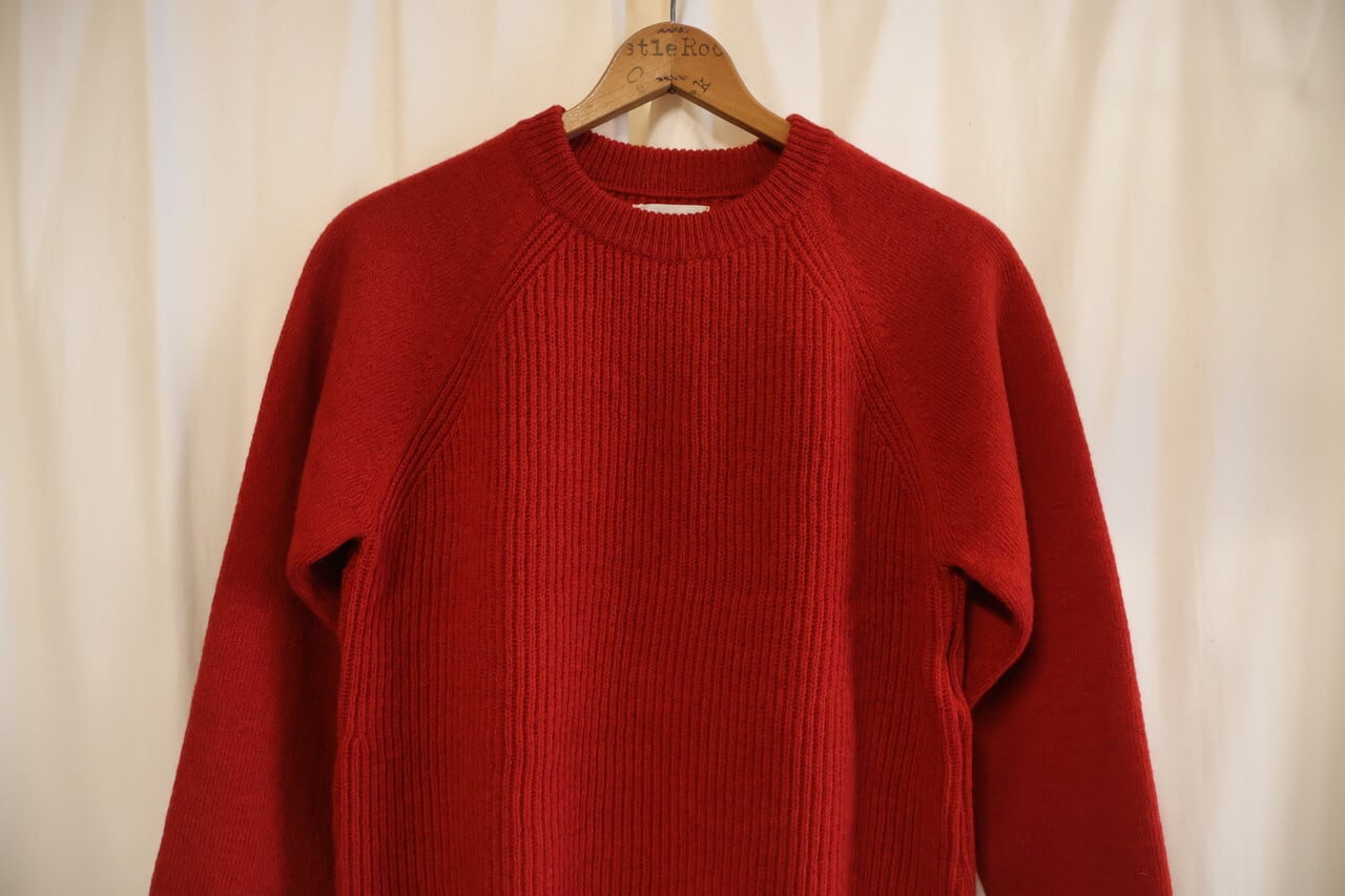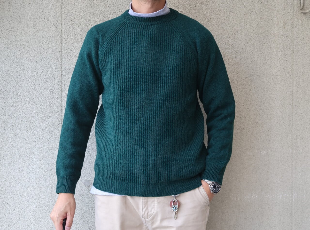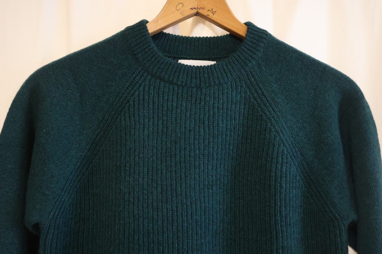 上質なシェットランドウール100%素材で編み立てたシンプルなラグランスリーブのクルーネックニット、身頃と袖で編み方を変えたデザインが特徴的