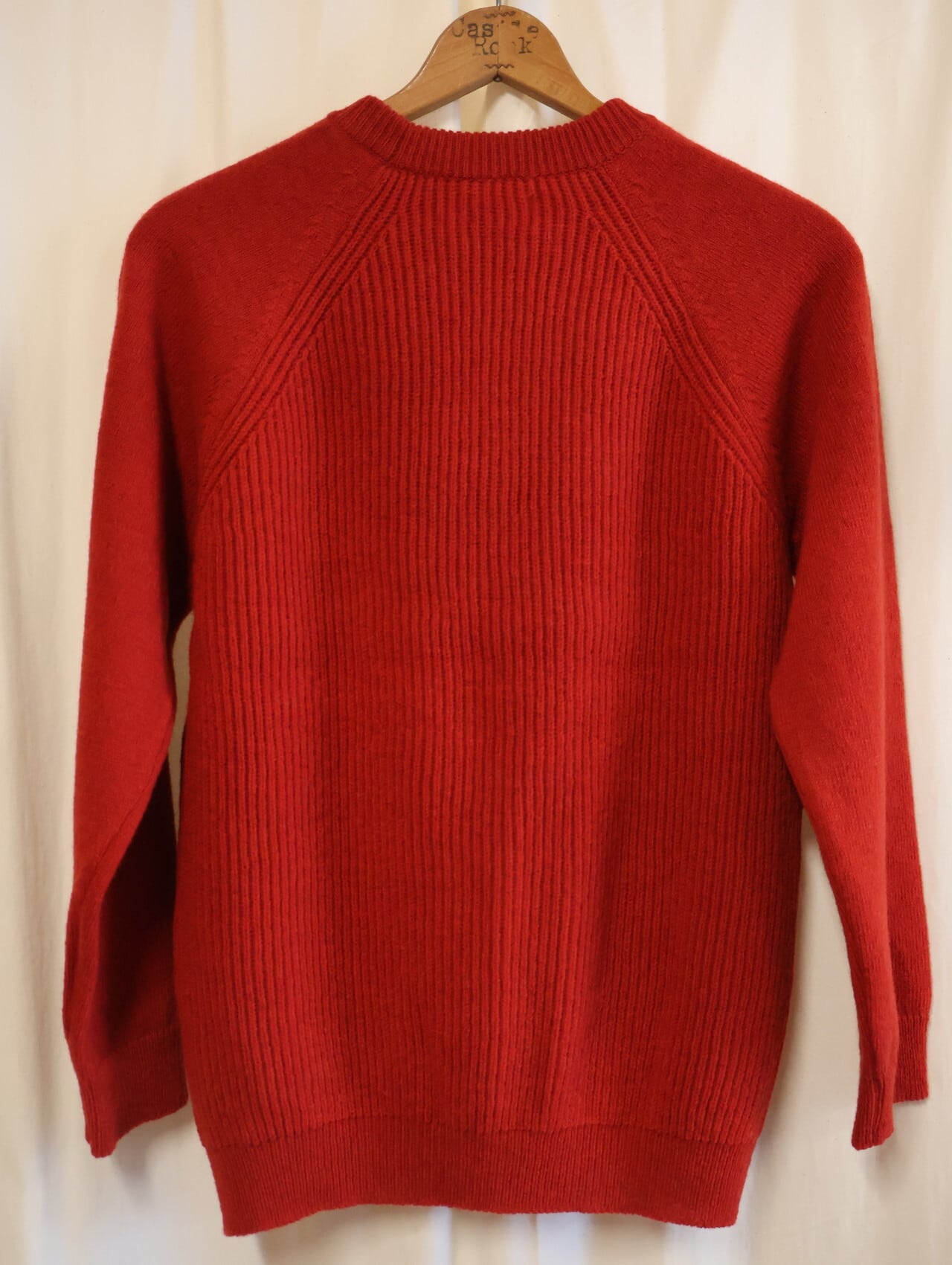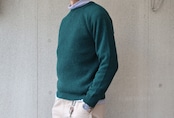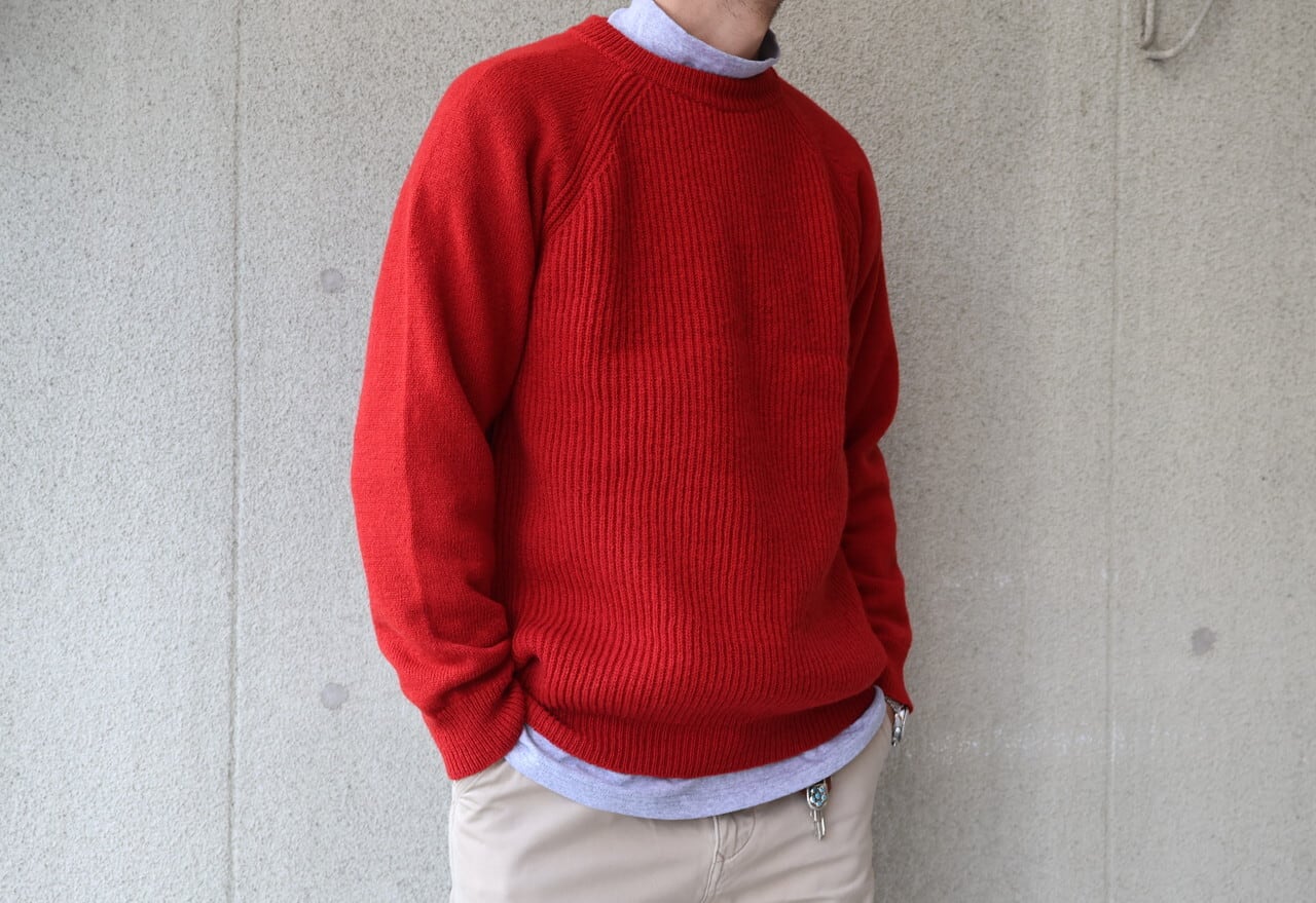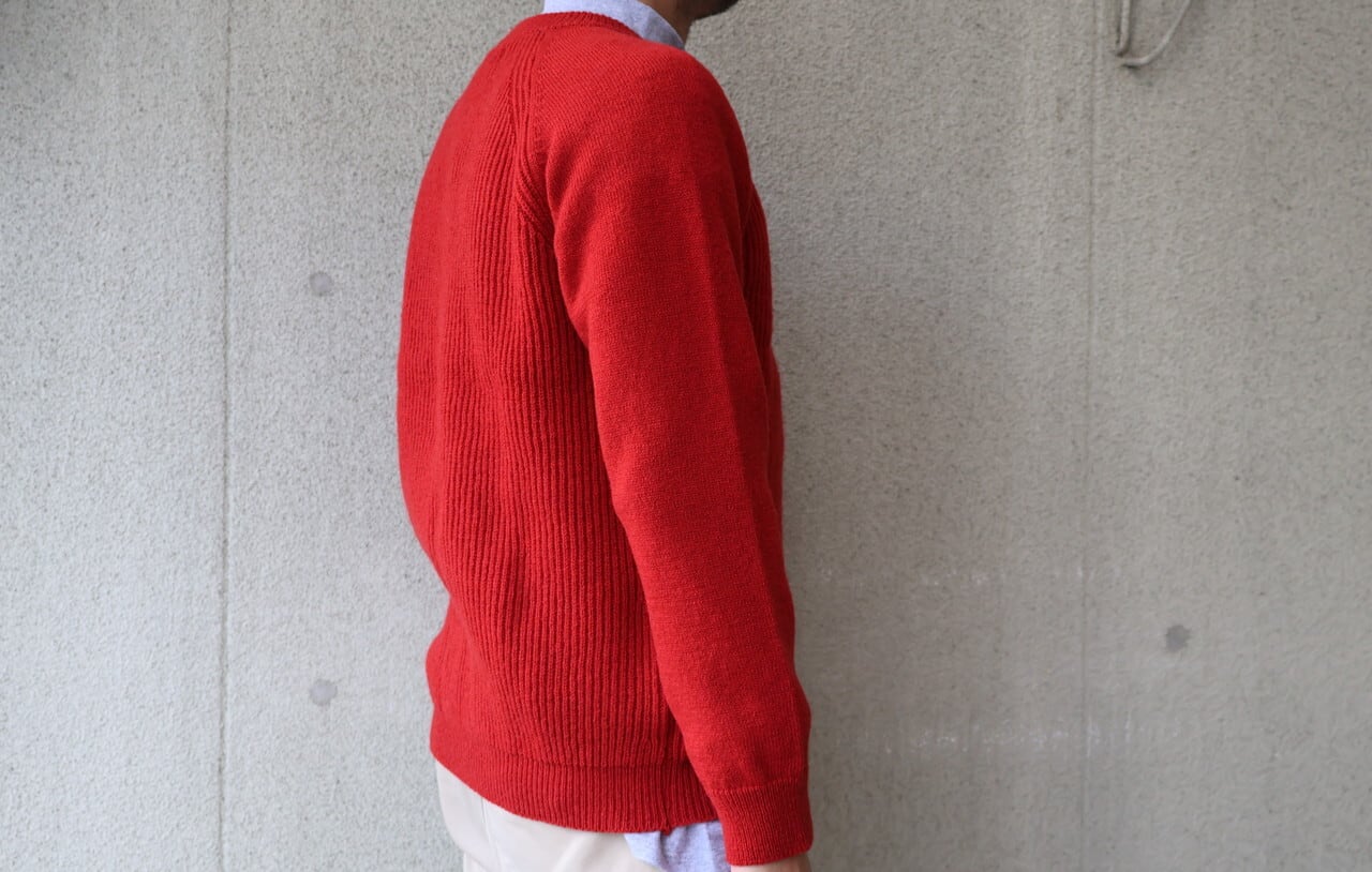 上質なシェットランドウール100%素材で編み立てたシンプルなラグランスリーブのクルーネックニット、身頃と袖で編み方を変えたデザインが特徴的