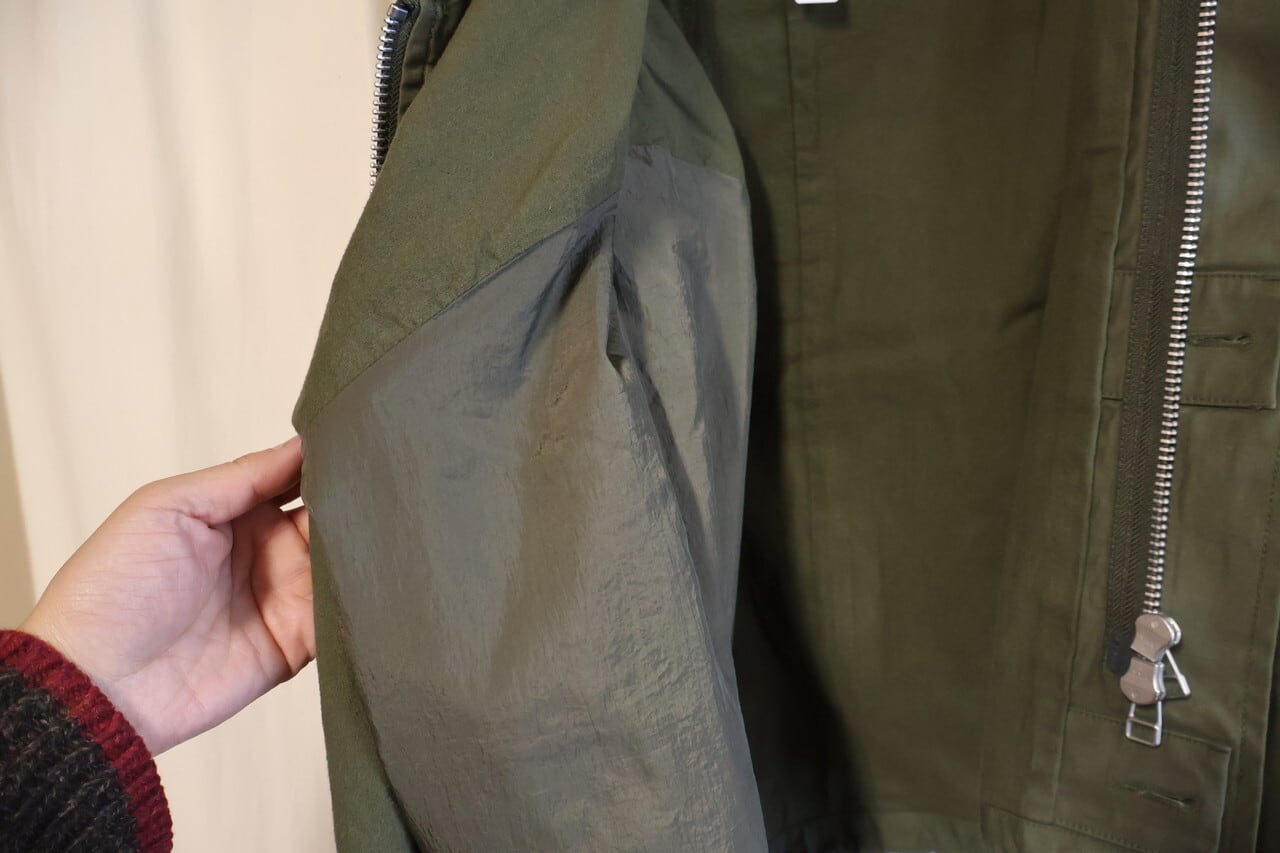 しっかりとしたバックサテン生地を使用した、ユーティリティージャケット