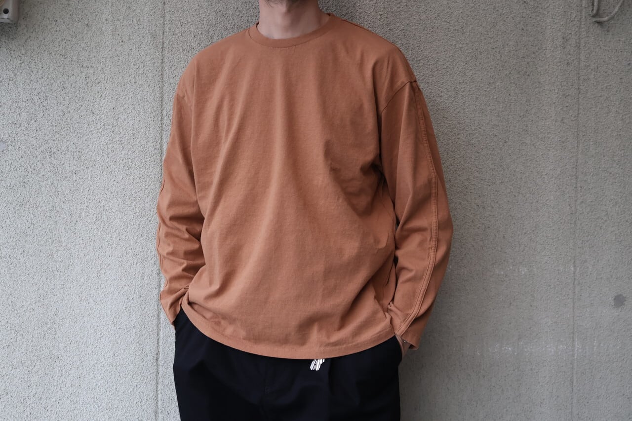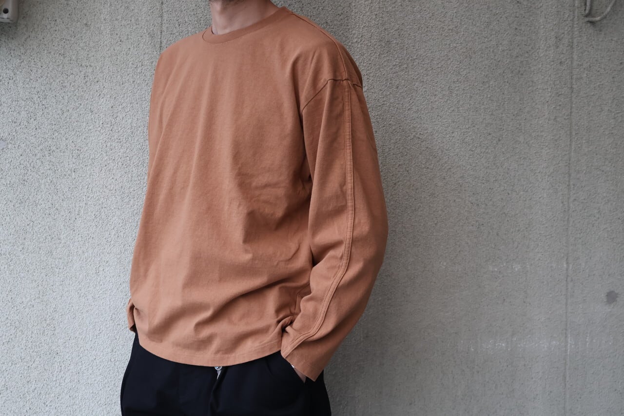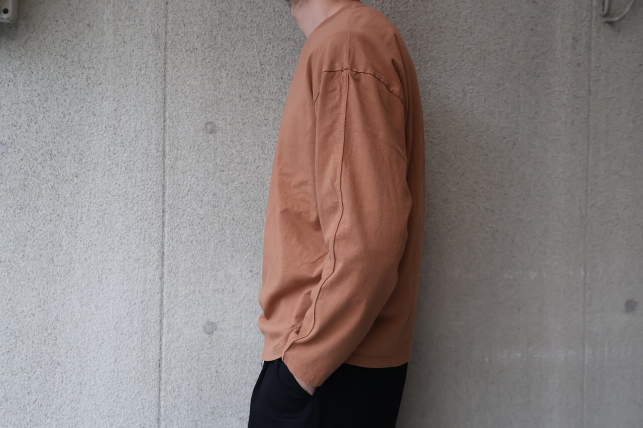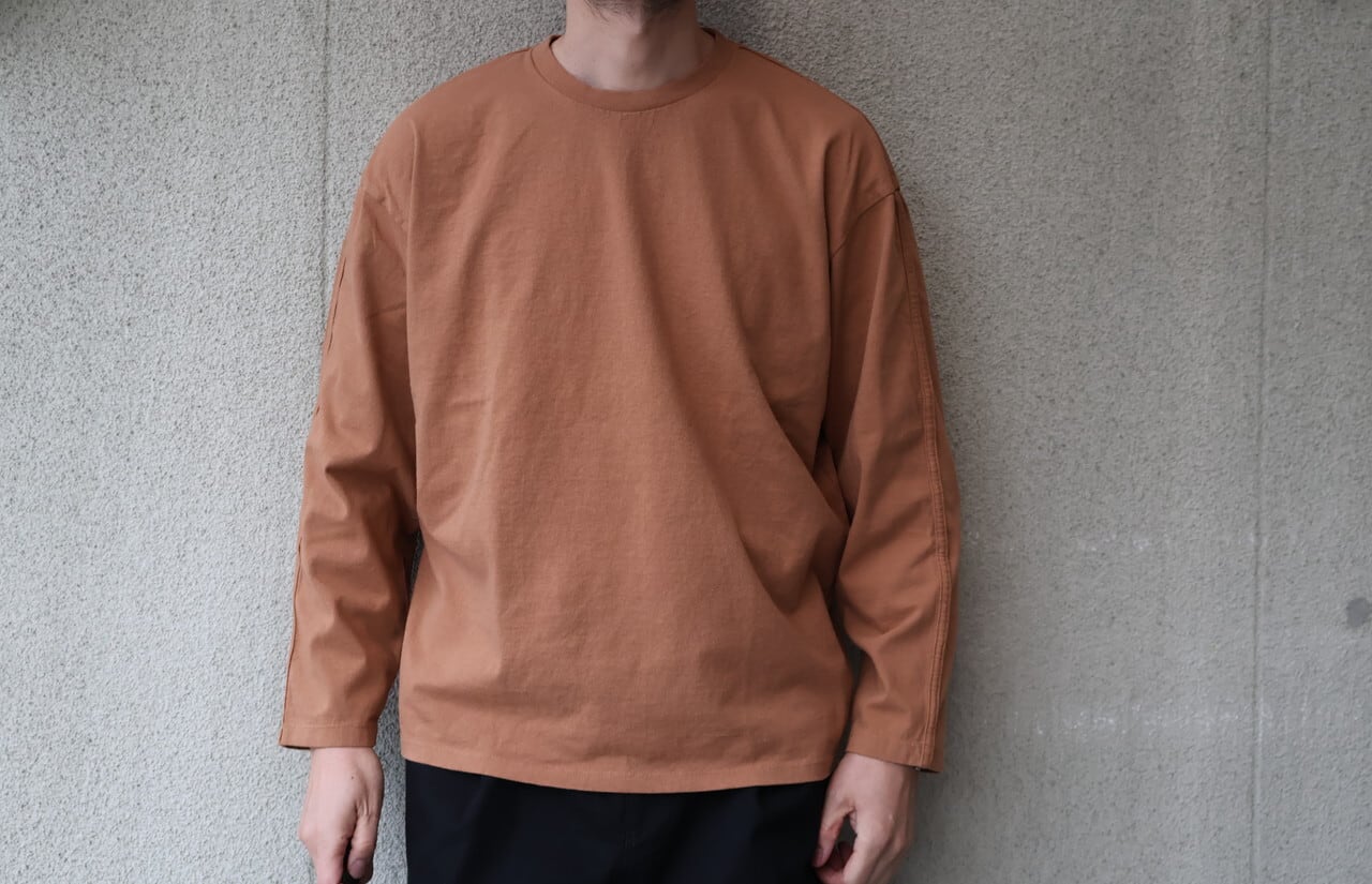 定番18番手糸のアメリカコットンを使用した、袖切り替えにタコバインダー始末を施したロンTです