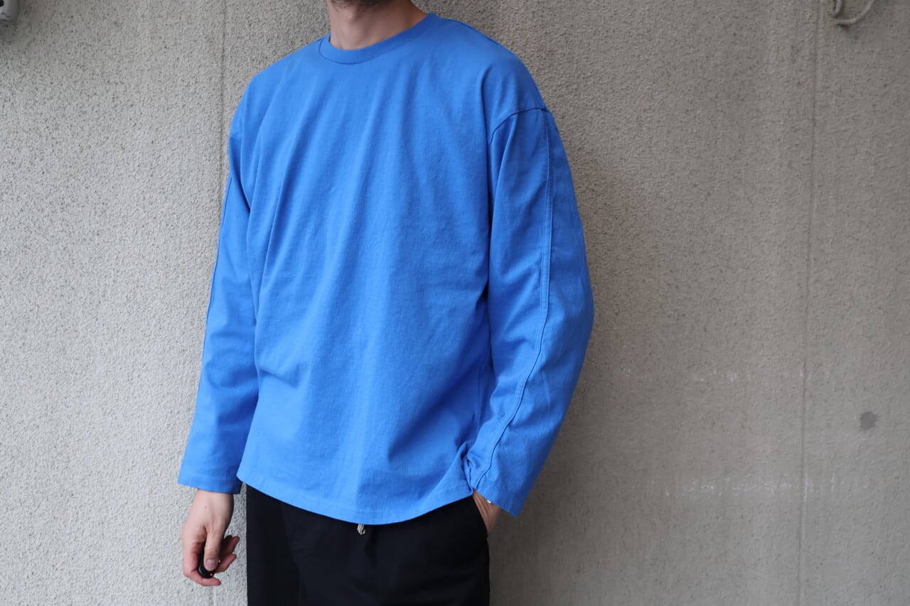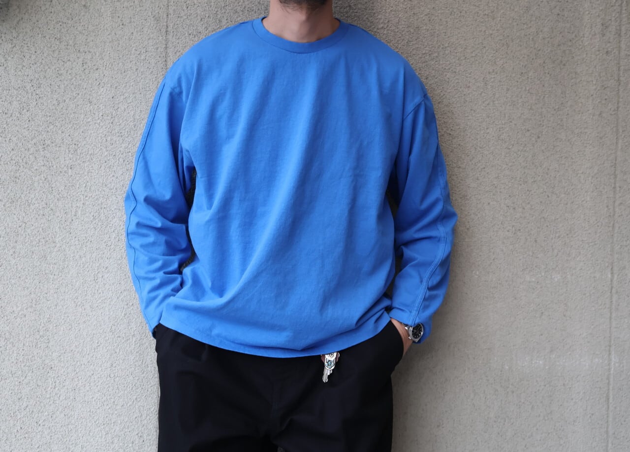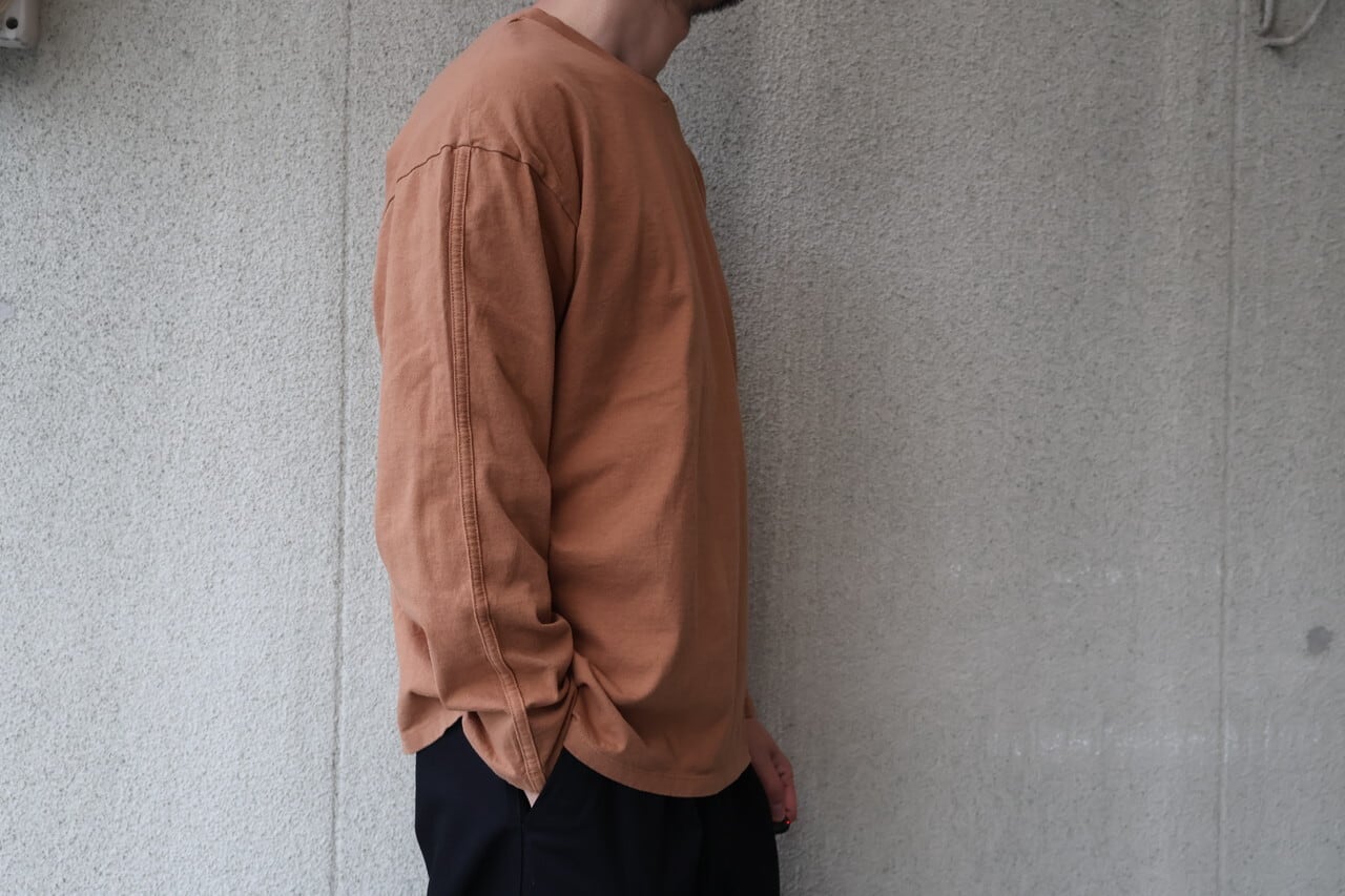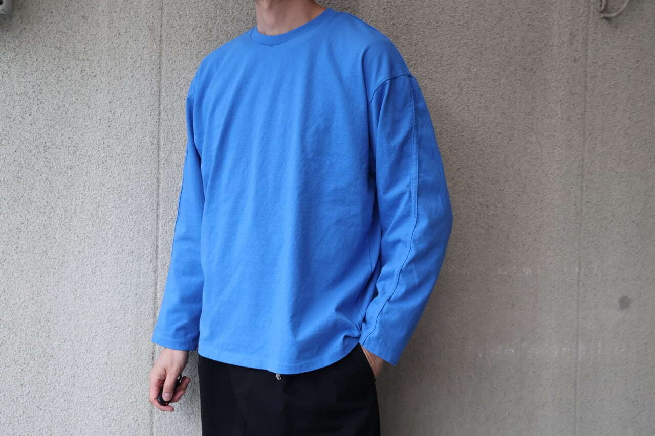 定番18番手糸のアメリカコットンを使用した、袖切り替えにタコバインダー始末を施したロンTです
