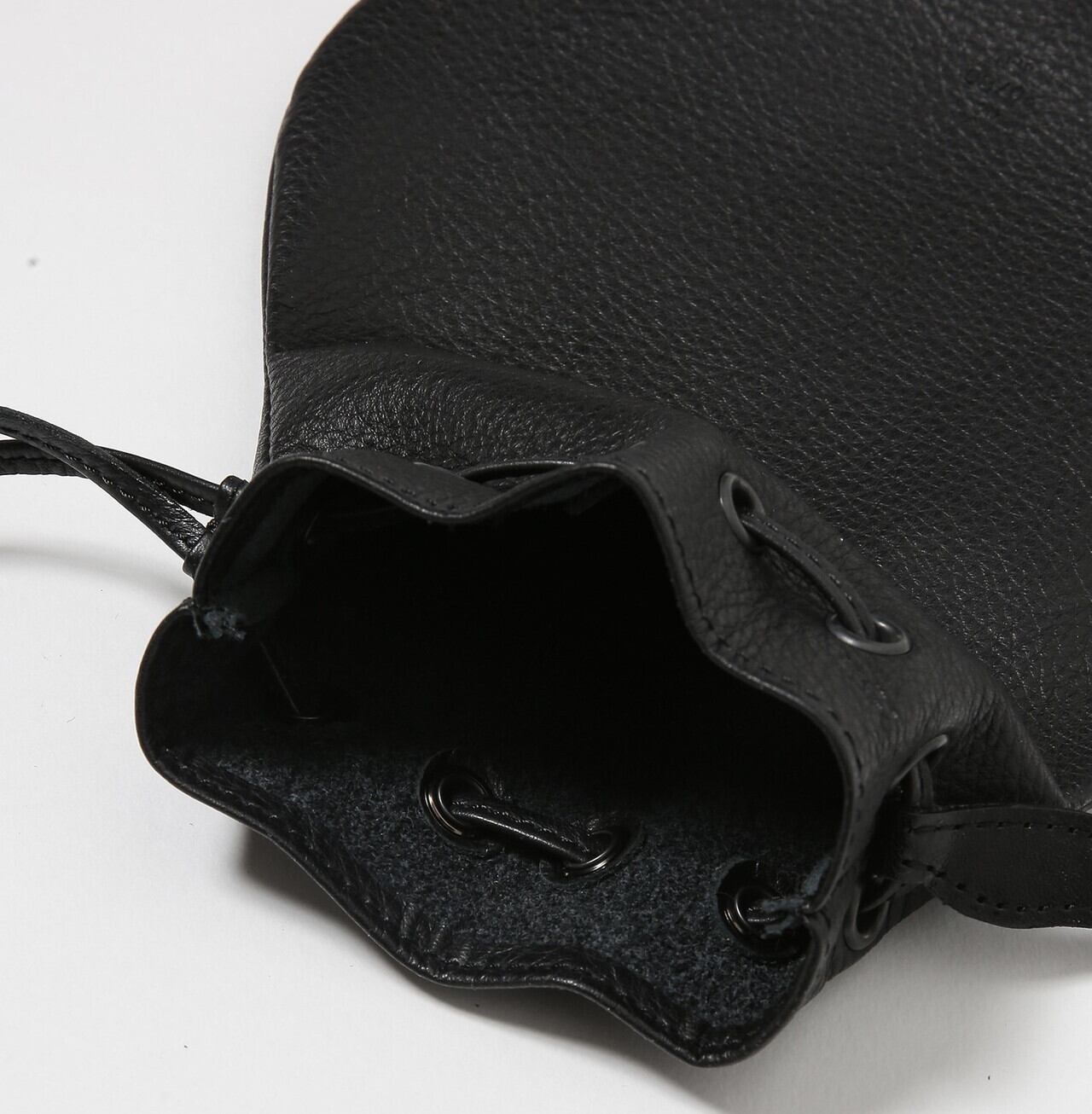 ストラップは片側から引っ張るドローストリング仕様になっており、反対側にはヌメ革の葉っぱが付いています