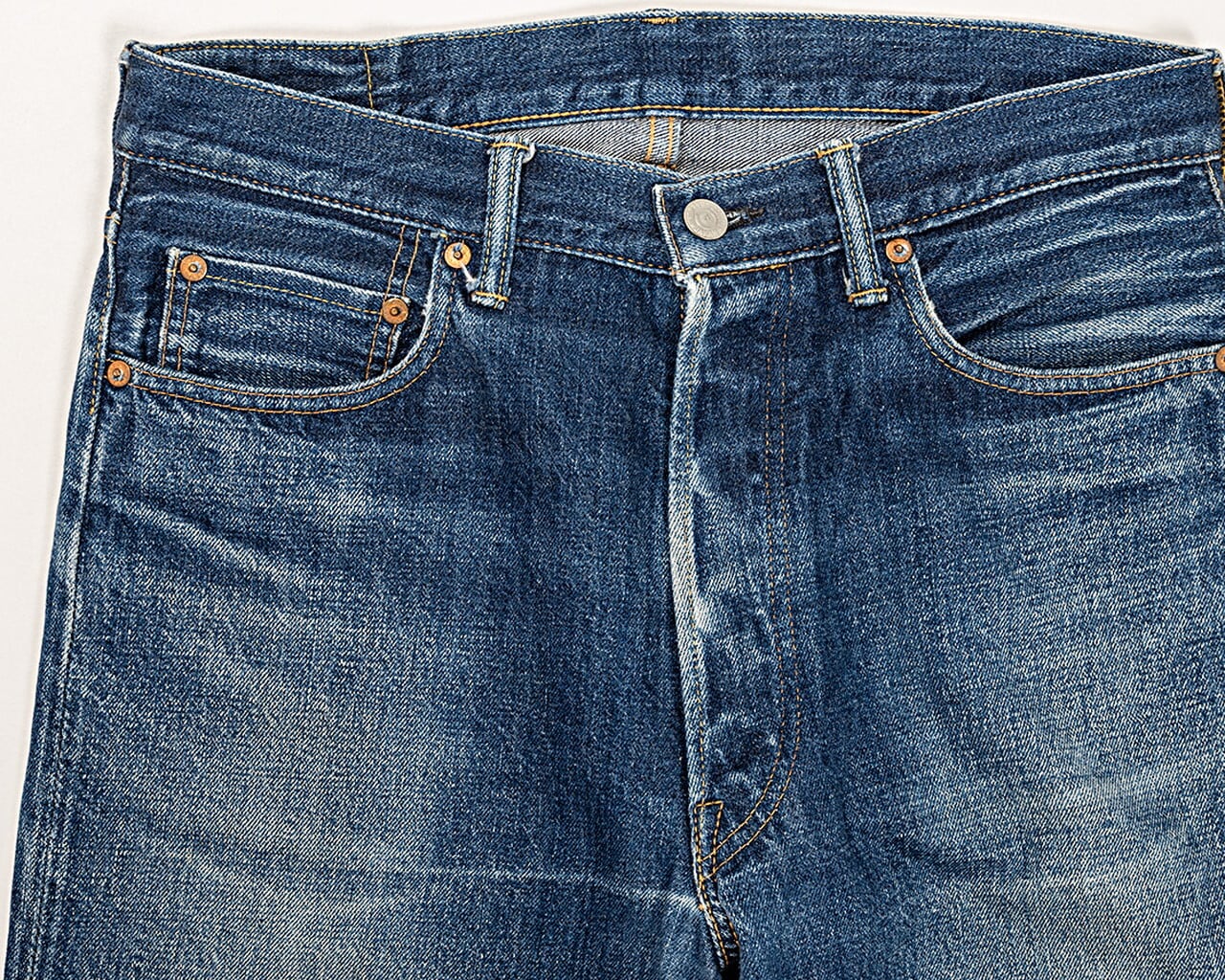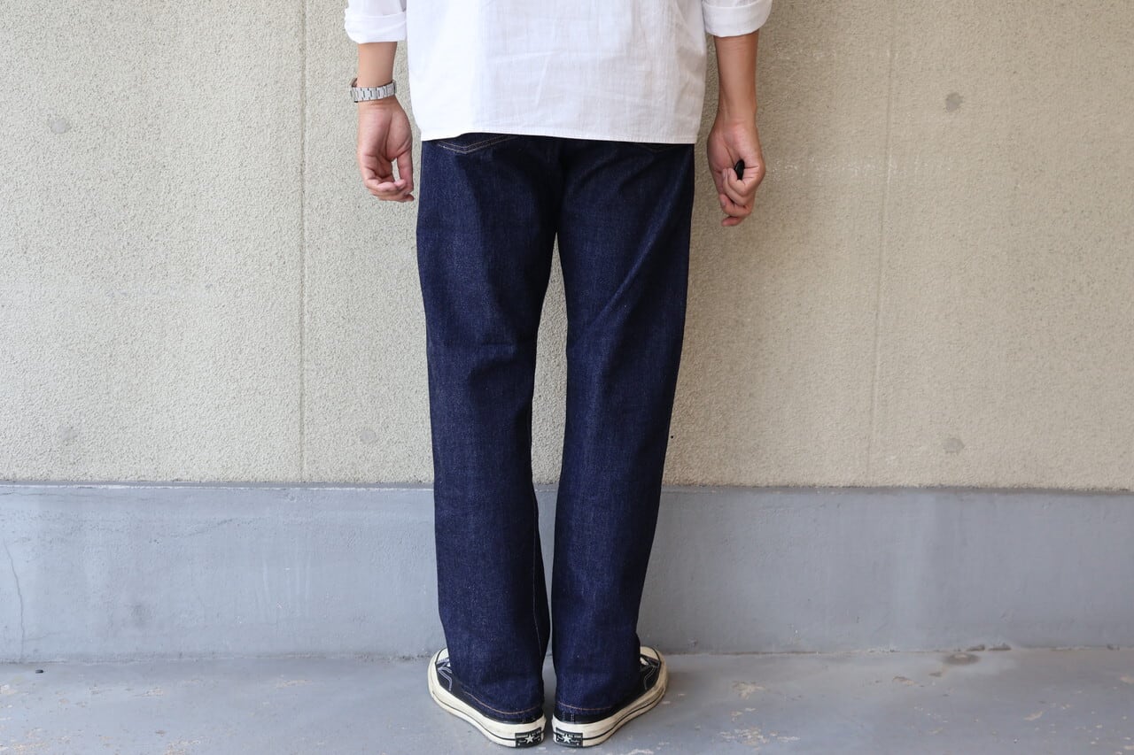 米国のアプランド綿を使ったデニム、脇の割、左右の身頃を合わせる通称「小股」、ヨーク、帯付けは太番手の糸を使用、ワンウォッシュ・乾燥機 未防縮