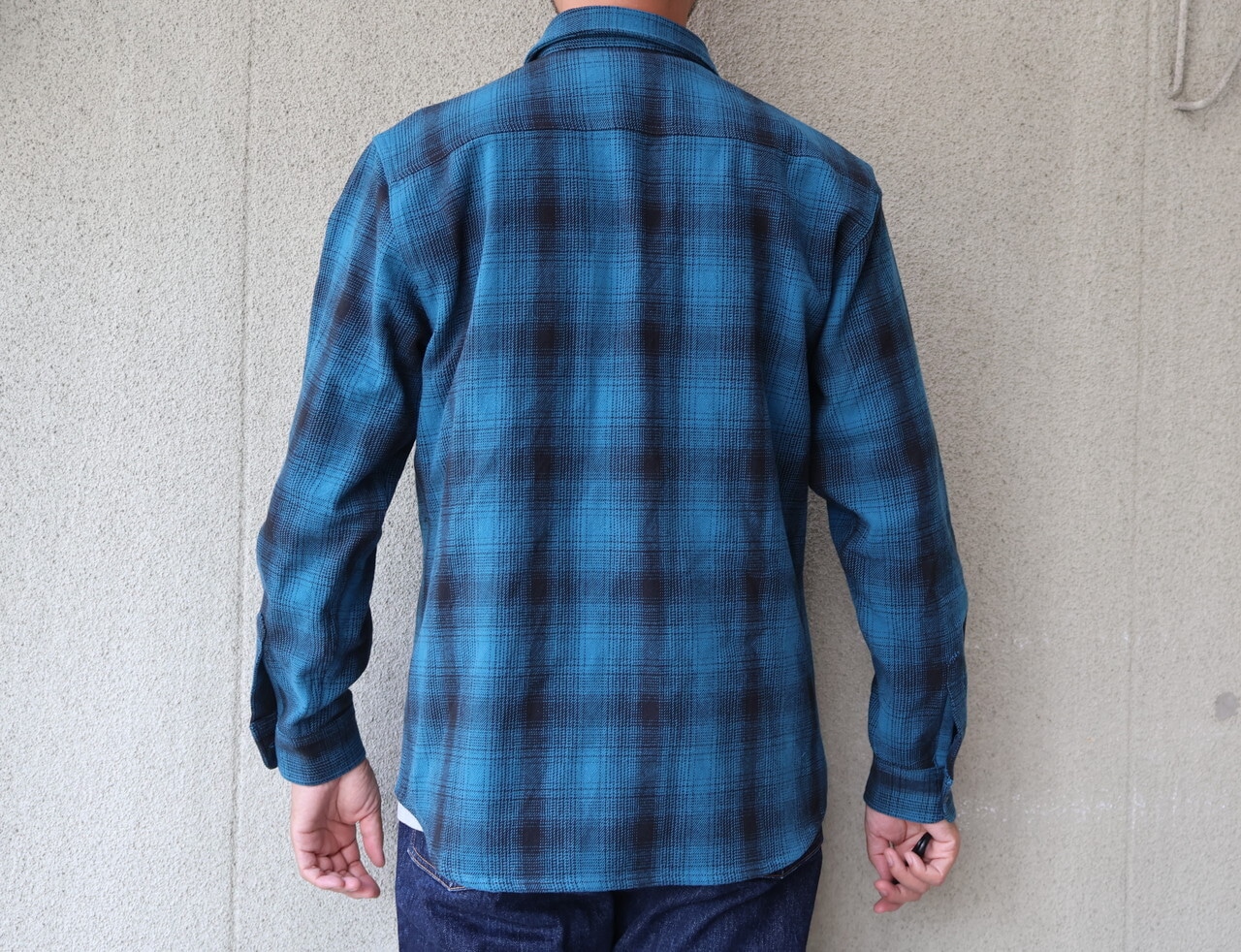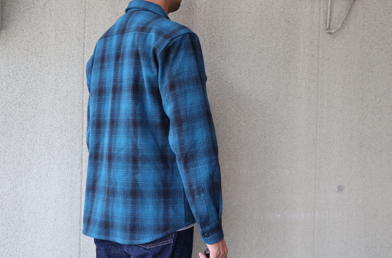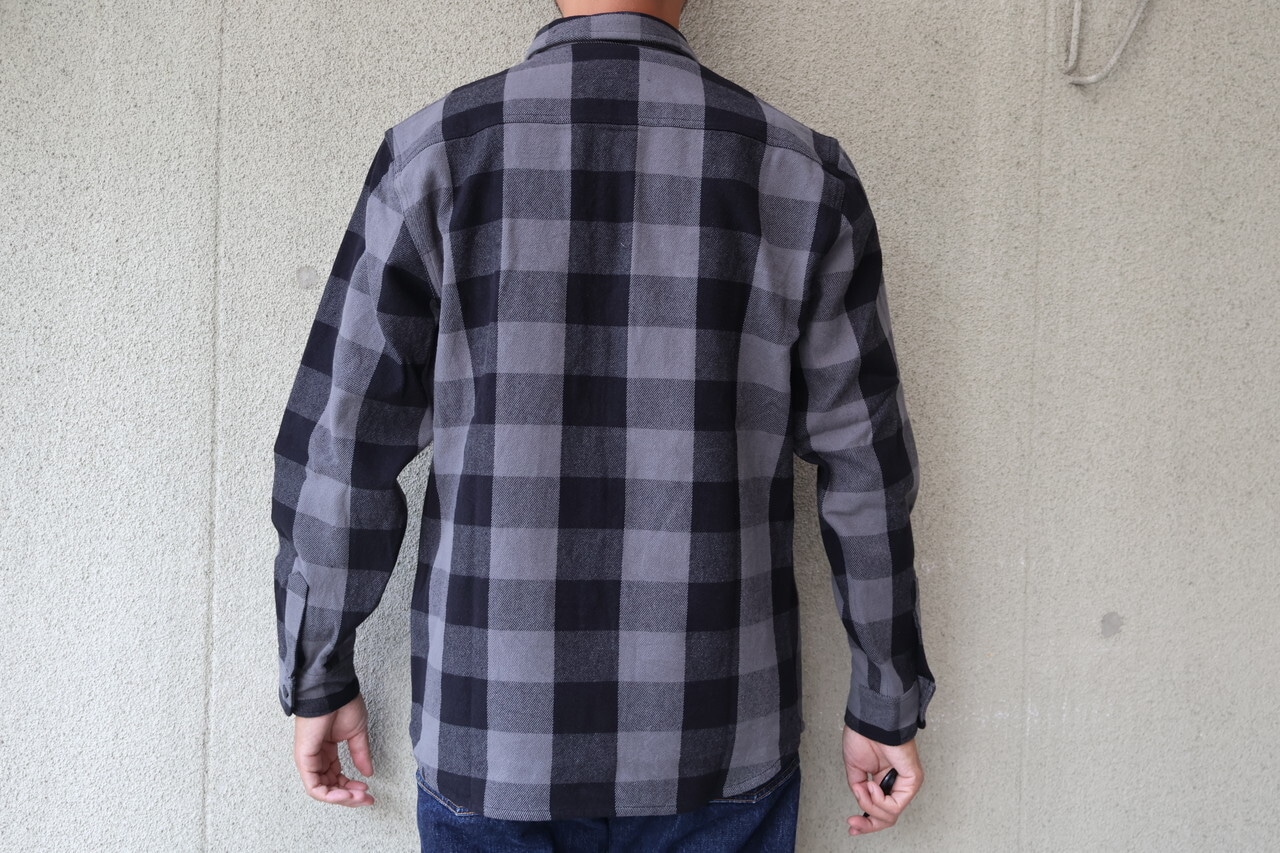 2本針巻き縫い縫製に猫目ボタンやフラップ付きの樽型ポケット仕様などビンテージ仕様の厚手のフランネルチェックシャツ