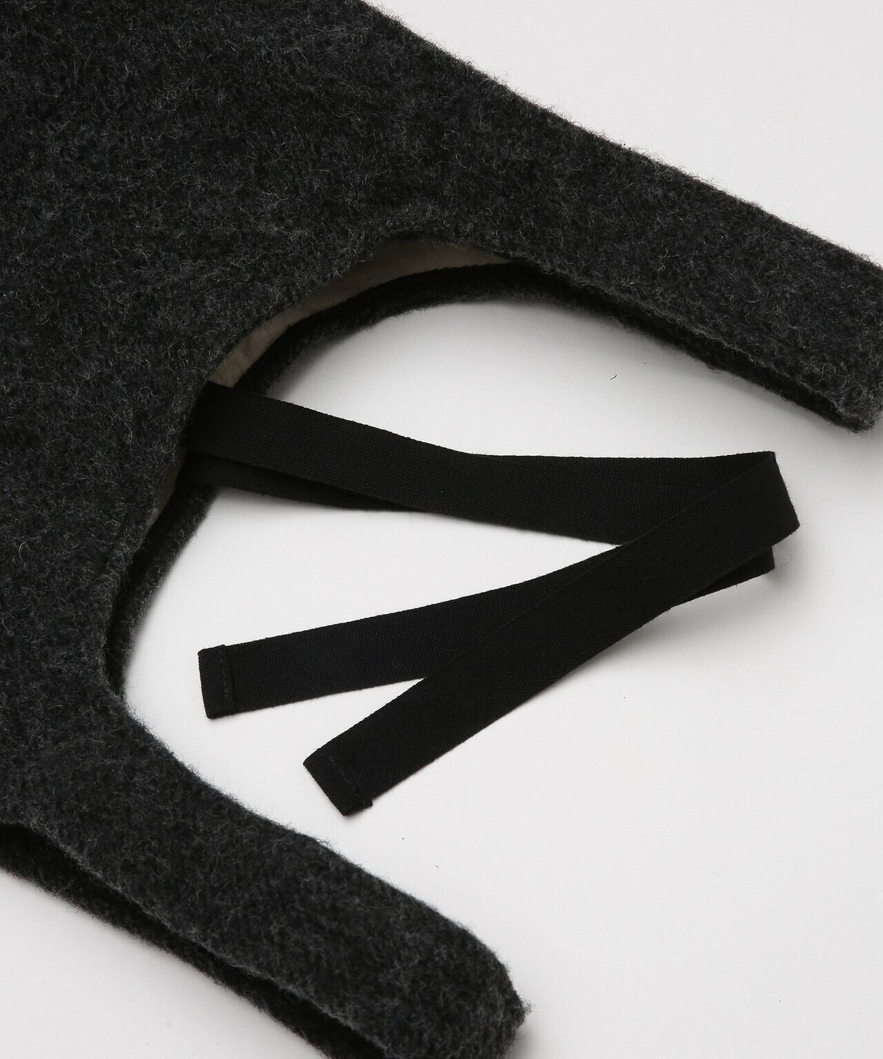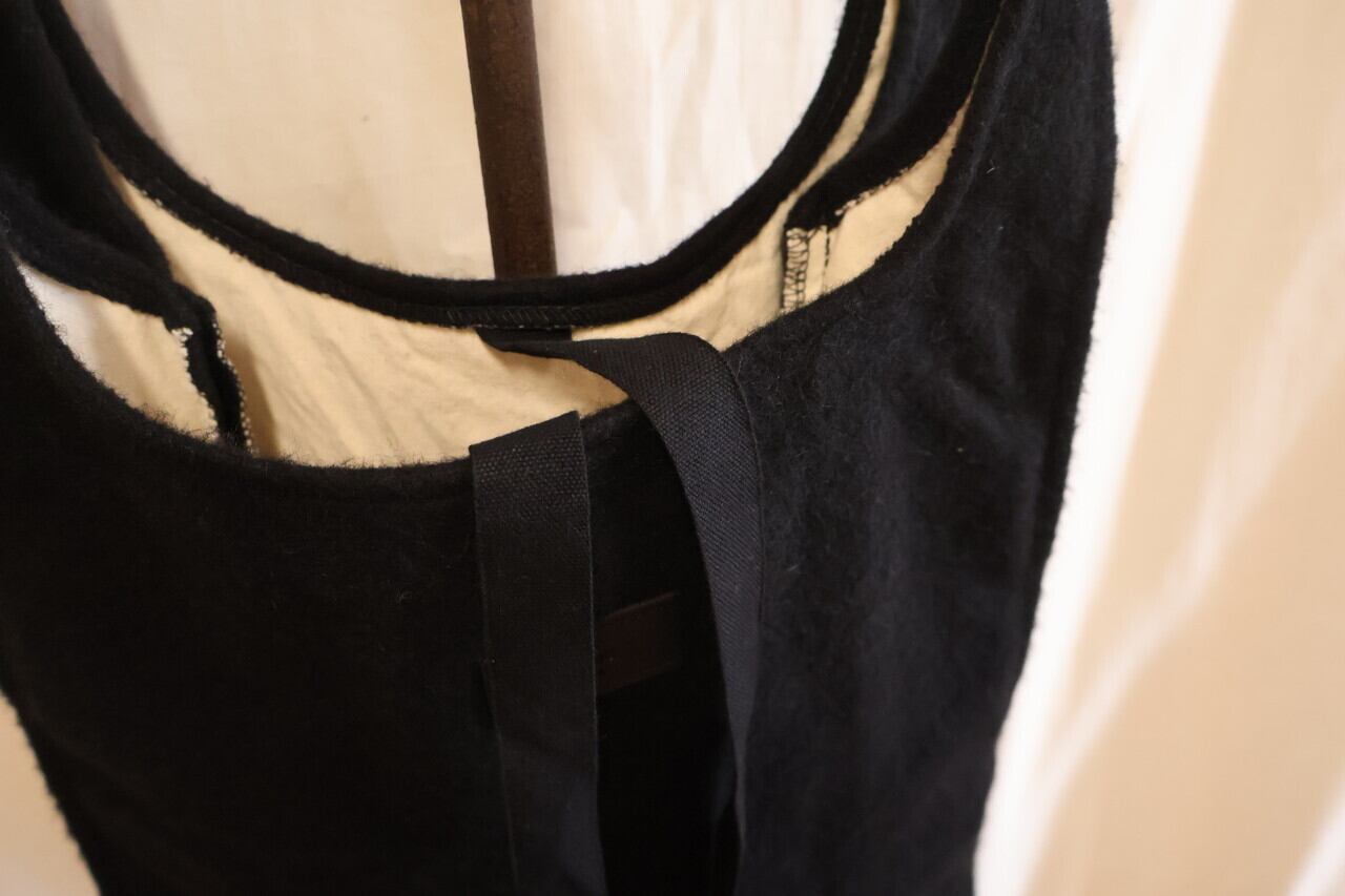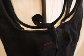 裏地のキャンバスは生成を使用、背面にはレザーパッチを配し、口元は結ぶこともできるよう長めのテープを付けています